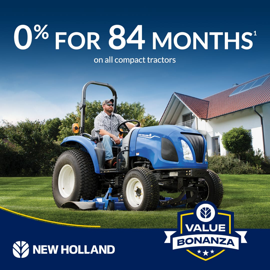 Receive 0% financing for 84 months on select new New Holland compact tractors. Payments starting as low as US$185 per month on WORKMASTER™ 25S sub-compact tractor with 100LC front loader. Ask how to add a mower for as little as $20/month.